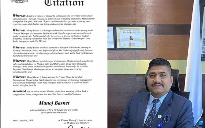 पुरा पढ्नुहोसन्यूर्याक(अमेरिका)–मिडिया व्यवस्थापनमा उत्कृष्ट कार्यकौशल देखाउदै दुरदर्शी नेतृत्व प्रदान गर्न सफल भएको भन्दै न्यूयोर्क राज्यका एसेम्बली मेम्बर डेभिड आई वेप्रिनले अन्नपूर्ण मिडिया नेटवर्कका महाप्रबन्धक मनोज बस्नेतलाई सम्मानित गरेका छन । अन्तराष्ट्रिय नारी दिवसको अवसरमा अमेरिकाको...