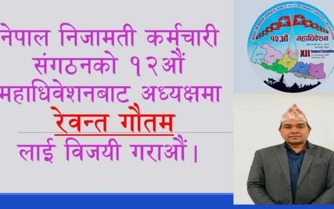 पुरा पढ्नुहोसकाठमाण्डौ, माघ ३० । नेपाल निजामती कर्मचारी संगठनको आसन्न १२औं महाधिवेसनमा रेवन्त गौतमले अध्यक्षमा उम्मेदवारी दिने भएका छन् । संगठनको केन्द्रीय उपाध्यक्ष समेत रहेका गौतमले उम्मेदवारी घोषणासँगै प्रचारप्रसार गर्न थालेका छन् । संगठनको स्पष्ट नीति...