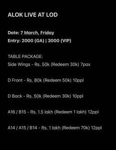 डीजे एलोकको प्रस्तुतीका दिन क्लबले २ हजार देखि ३ हजार रुपैयाँ टिकट राखिएको क्लबका निर्देशक भुपेन कुँवरले जानकारी दिए । उनका अनुसार दर्शकले खल्ती एपबाट टिकट खरिद गर्न सक्ने छन् । डान्स फ्लोरको २ हजार र भीआइपीको ३ हजार रुपैयाँ राखिएको छ। क्लबले अर्ली अग्रिम टिकट बिक्री भइसकेको छ ।