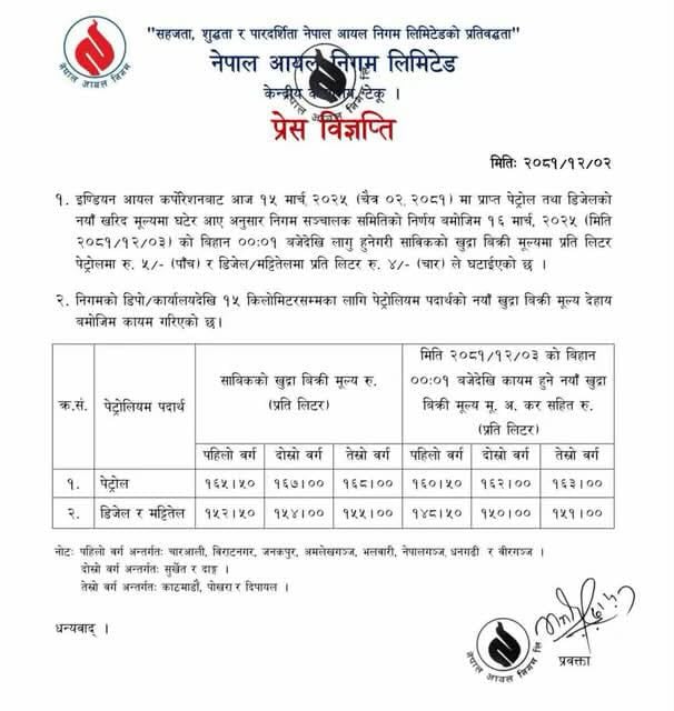 यस्तै तेस्रो वर्गअन्तर्गत पर्ने काठमाण्डौ, पोखरा र दिपायल क्षेत्रमा अब पेट्रोलको भाउ प्रतिलिटर एक सय ६३ रूपैयाँ तथा डिजेल–मट्टीतेलको प्रतिलिटर एक सय ५१ रूपैयाँ पर्नेछ ।