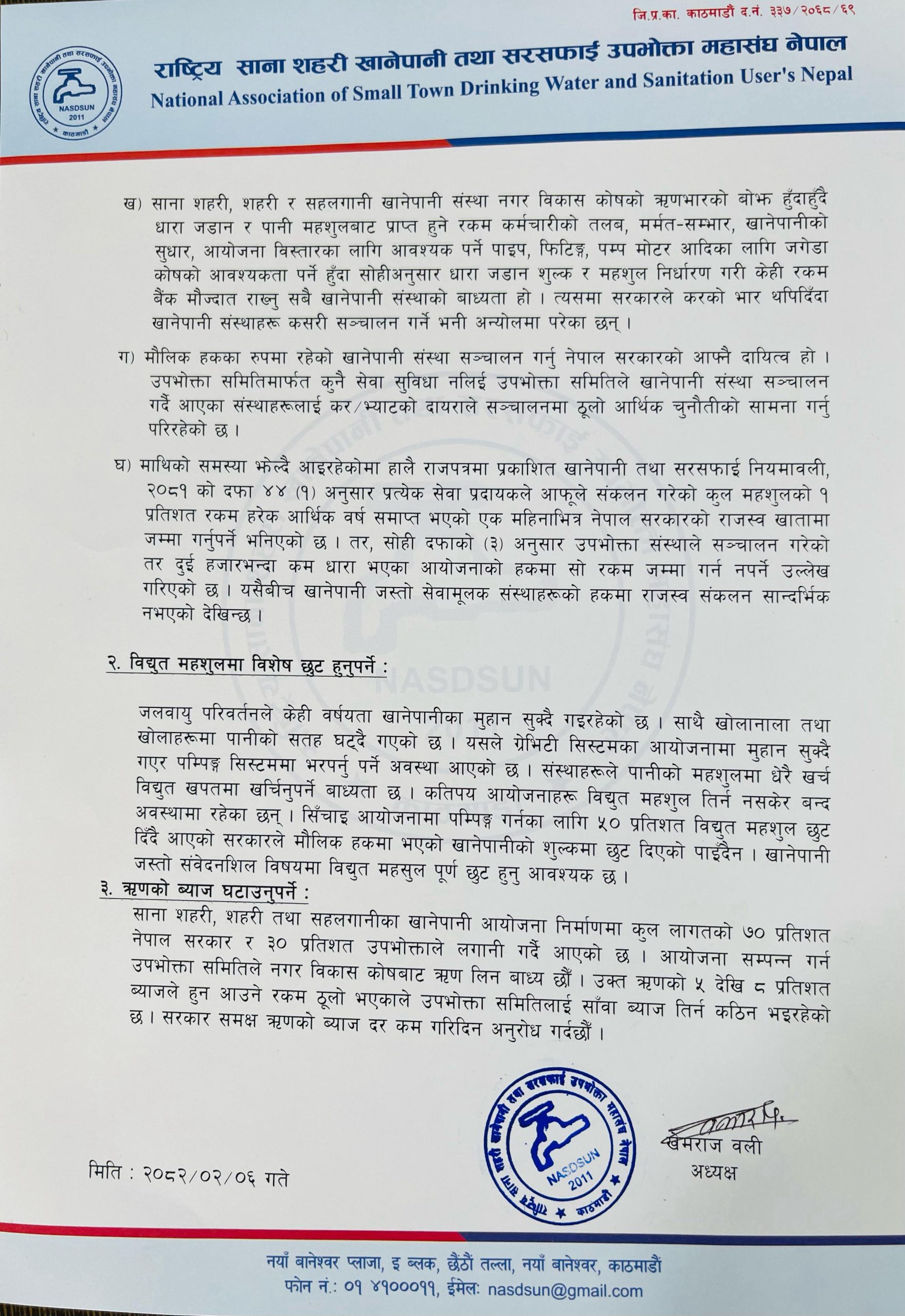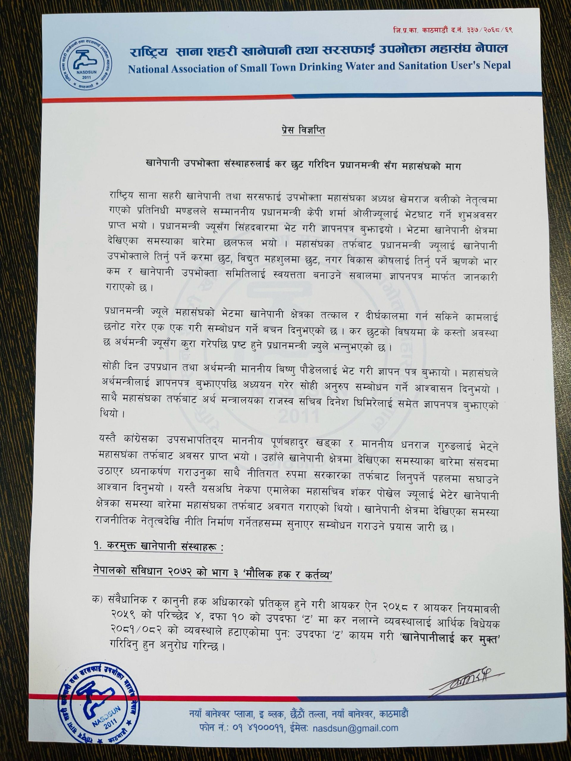 ‘प्रधानमन्त्रीसँग भेट गरी ज्ञापन पत्र बुझायो, भेटमा खानेपानी क्षेत्रमा देखिएका समस्याबारे छलफल भयो, महासंघका तर्फबाट प्रधानमन्त्रीलाई खानेपानी उपभोक्ताले तिर्नुपर्ने करमा छुट, विद्युत महशुलमा छुट, नगर विकास कोषलाई तिर्नुपर्ने ऋणको भार कम र खानेपानी उभोक्ता समितिलाई स्वयत्तता बनाउने सवालमा ज्ञापनपत्रमार्फत जानकारी गराएको छ,’ विज्ञप्तिमा भनिएको छ ।