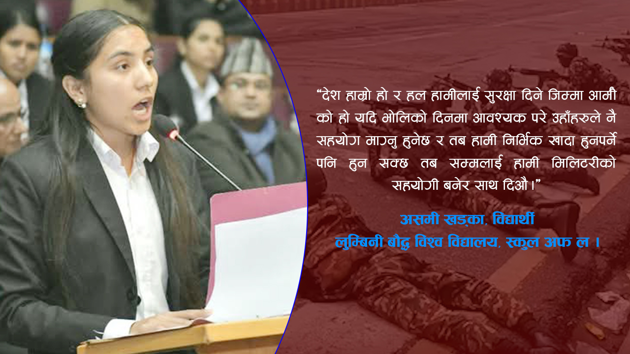 अहिले, यो देश राज्येबिहिनताको आवस्थामा छ। संवैधानिक प्रावधानहरू लागू गर्ने निकाय अब जीवित छैन। हामीले हाम्रो देश गुमायौं, र हामीले विधिको शासन गुमायौं। हामी हाल नेतृत्वविहीन, दिशाविहीन छौं। नेपाल एउटा खतरनाक मोडमा उभिएको छ।यस जटिल मोडमा, नेपाली सेना हाम्रो अन्तिम आशा हो। अन्य सबै प्रणाली या त ध्वस्त भएका छन् वा भ्रष्ट भएका छन्। यदि सेना पनि असफल भयो वा यसको दुरुपयोग भयो भने, नेपाल दशकौँ पछाडि धकेलिनेछ, सायद सधैँका लागि।